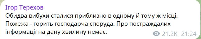 21.21 Еще один взрыв в Харькове, сообщил глава ОВА Синегубов.