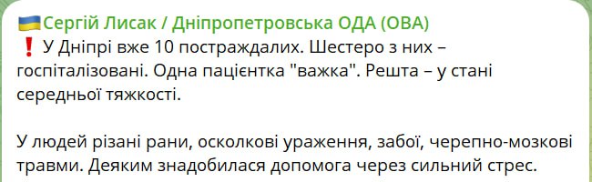 23.41 В Днепре уже 10 пострадавших после атаки "Шахедов", сообщает глава ОВА Лысак.
