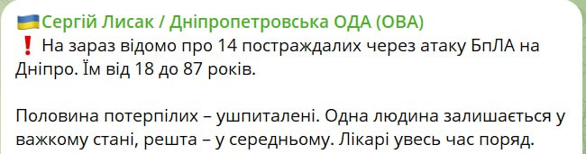 23.58 В Днепре известно уже о 14 пострадавших из-за атаки "Шахедов", сообщил начальник Днепропетровской ОВА Сергей Лысак.
