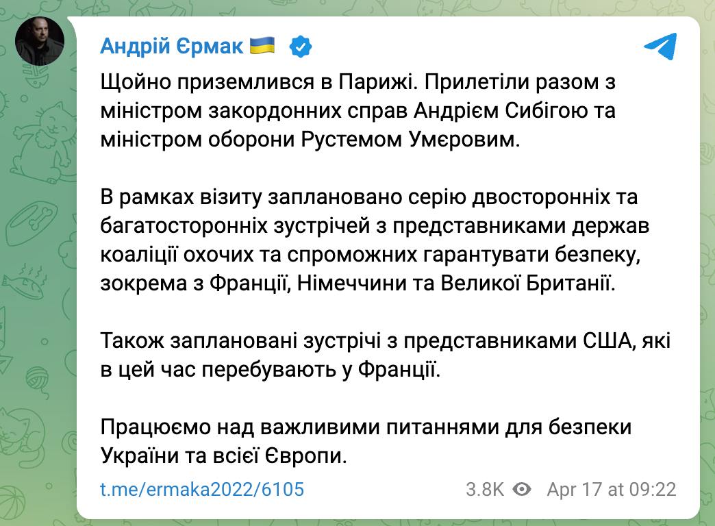 Также запланированы встречи с представителями США, которые в настоящее время находятся во Франции", - написал Ермак.