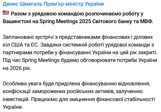 "Вместе с правительственной командой приступаем к работе в Вашингтоне на Spring Meetings 2025 Всемирного банка и МВФ", - написал премьер.