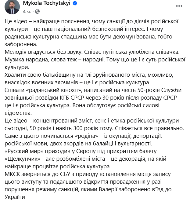 Министр культуры Николай Точицкий сказал, что обратится в СБУ для установления места записи видео и последующего открытия производства в случае нарушения российской певицей санкций, запрещающих ей въезжать в Украину.