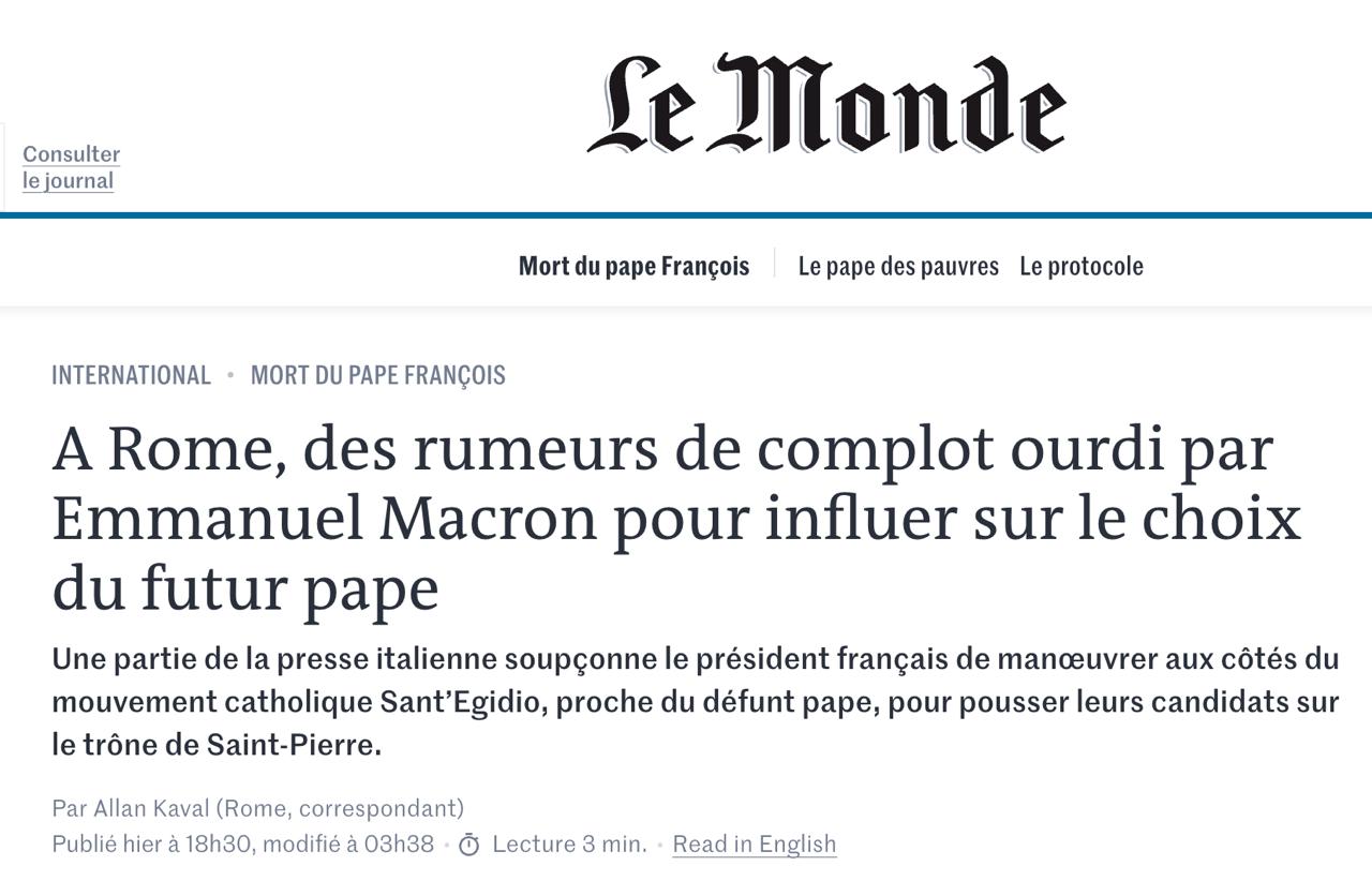 Итальянские правые говорят о связях Макрона с католическим движением община святого Эгидия, которое было близко к покойному папе Франциску, и вовлечённости этого влиятельного сообщества во внутренние разногласия, сотрясающие итальянскую церковь, особенно после смерти папы.
