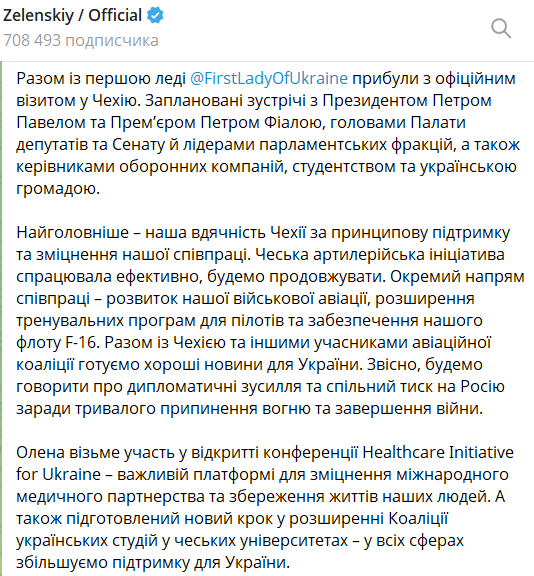 "Отдельное направление сотрудничества - развитие нашей военной авиации, расширение тренировочных программ для пилотов и обеспечение нашего флота F-16. Вместе с Чехией и другими участниками авиационной коалиции готовим хорошие новости для Украины", - написал Зеленский.