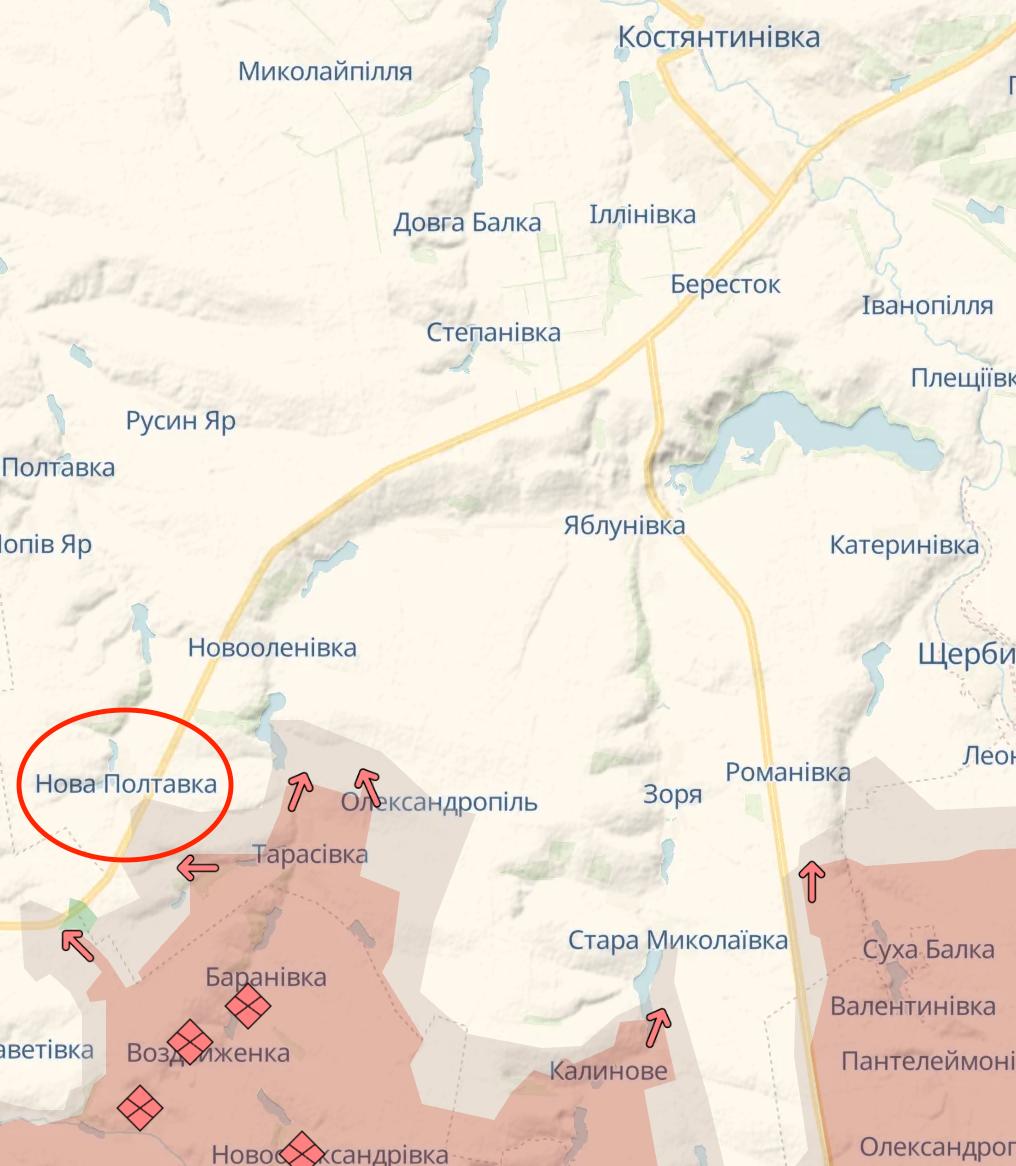 Армия РФ продолжает продвигаться в районе трассы Покровск-Константиновка и зашла уже в Новую Полтавку по ту сторону дороги.