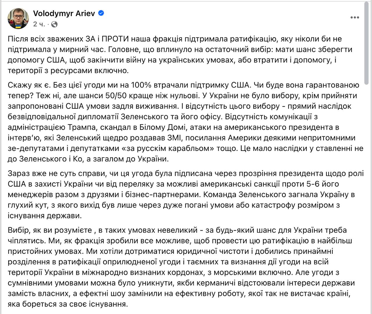 Арьев также раскритиковал Владимира Зеленского за то, что Украина в итоге получила именно такое соглашение. Он полагает, что это стало следствием "безответственной дипломатии", конфликта в Белом доме и публичной критики Белого дома. Такая политика поставила под угрозу "существование государства", заявил Арьев.