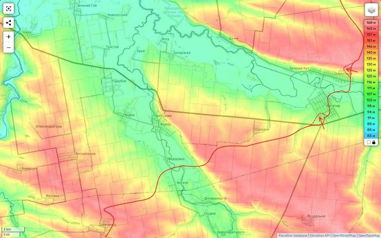 Судя по картам, после Богатыря для российской армии открывается путь на 13 километров вперед без населенных пунктов - до сел Ялта и Запорожье. Откуда чуть более километра до границы Днепропетровской области.