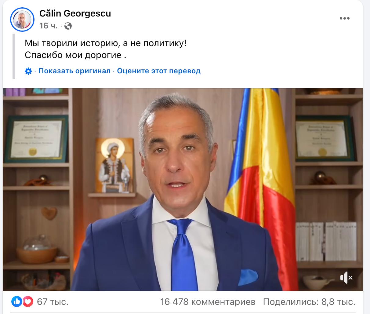 Напомним, Джорджеску победил в первом туре президентских выборов, однако результаты голосования отменили из-за якобы вмешательства России, которое так и не было доказано.