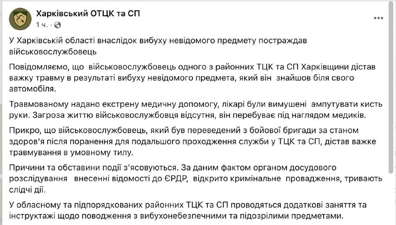 "Сообщаем, что военнослужащий одного из районных ТЦК и СП Харьковщины получил тяжелую травму в результате взрыва неизвестного предмета, который он нашел возле своего автомобиля. Травмированному оказана экстренная медицинская помощь, врачи были вынуждены ампутировать кисть руки", - сказано в публикации.