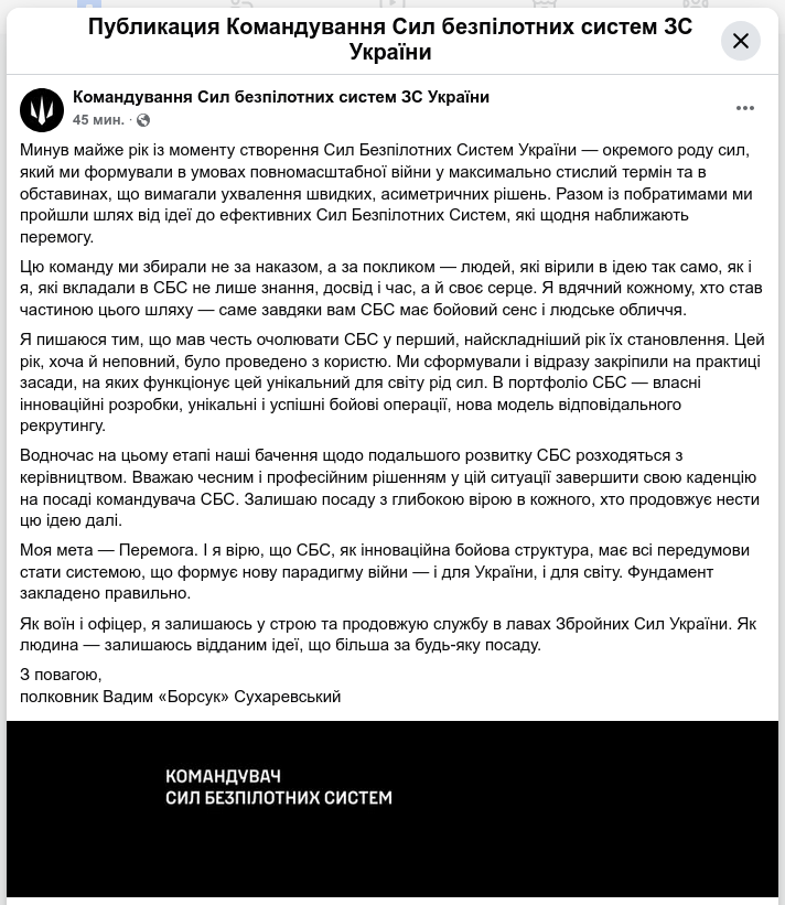 Полковник Вадим Сухаревский уходит с должности командующего Силами беспилотных систем (СБС) ВСУ, потому что его взгляды на перспективы этого рода войск "расходятся с руководством".