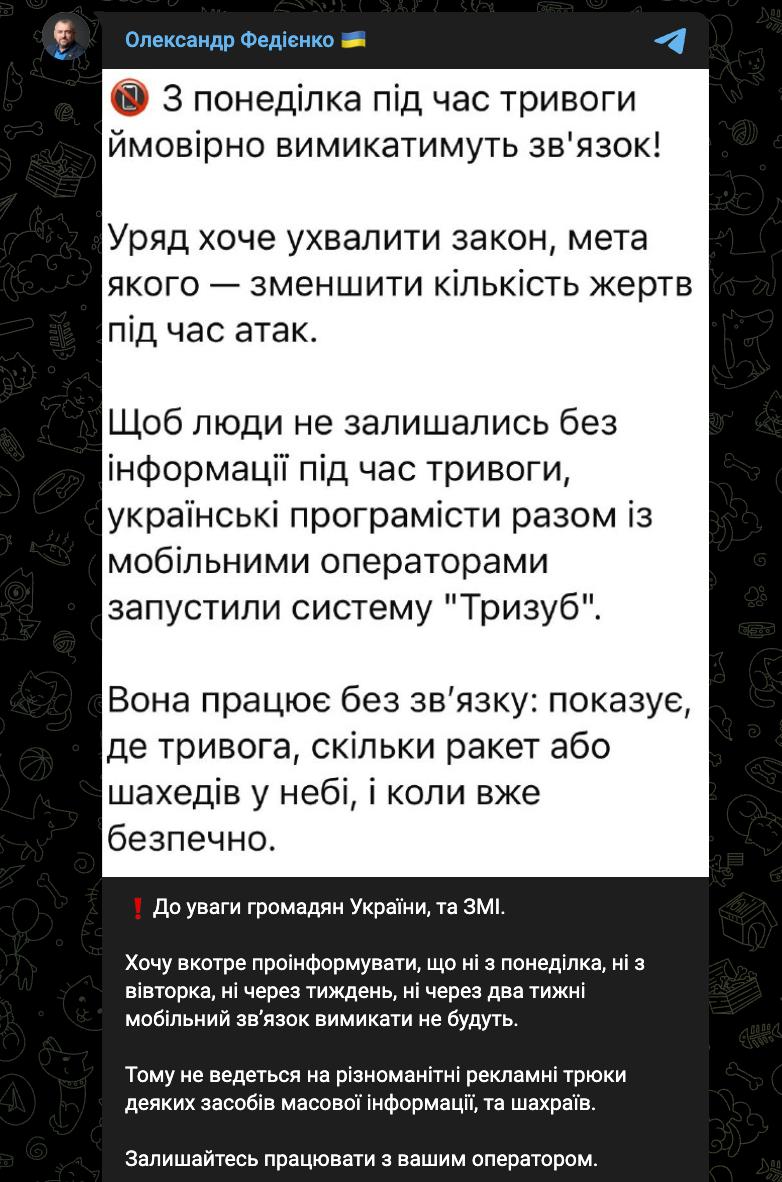 "Ни с понедельника, ни со вторника, ни через неделю, ни через две недели мобильную связь выключать не будут. Поэтому не ведитесь на различные рекламные трюки некоторых средств массовой информации и мошенников", - заявил Федиенко.