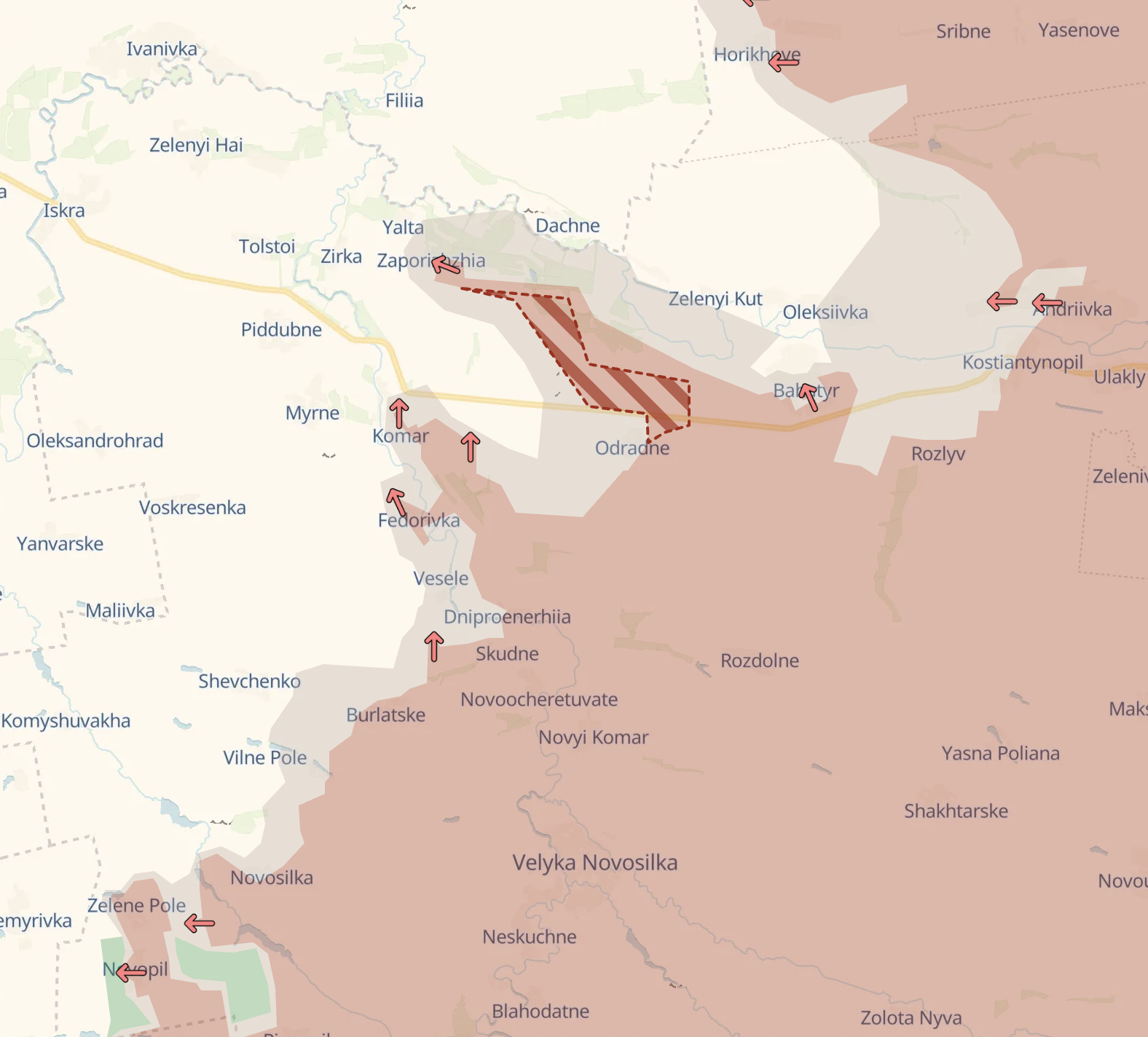 По мнению Машовца здесь российские войска двигаются в сторону села Запорожье и пытаются вытеснить украинские силы из Алексеевки, расположенной на противоположном берегу реки Волчья (паблики РФ и некоторые украинские военные говорят, что Алексеевка полностью захвачена, но Deep State помещает ее в "серую зону").