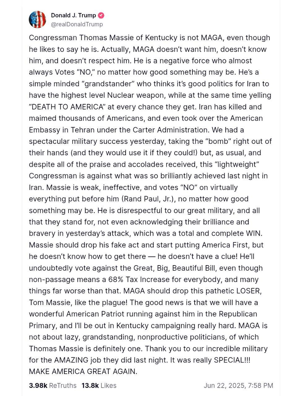 В своей соцсети он обрушился на конгрессмена-республиканца Томаса Мэсси, который на днях примкнул к группе демократов, желающих заблокировать возможность Трампа начать войну без одобрения Конгресса.