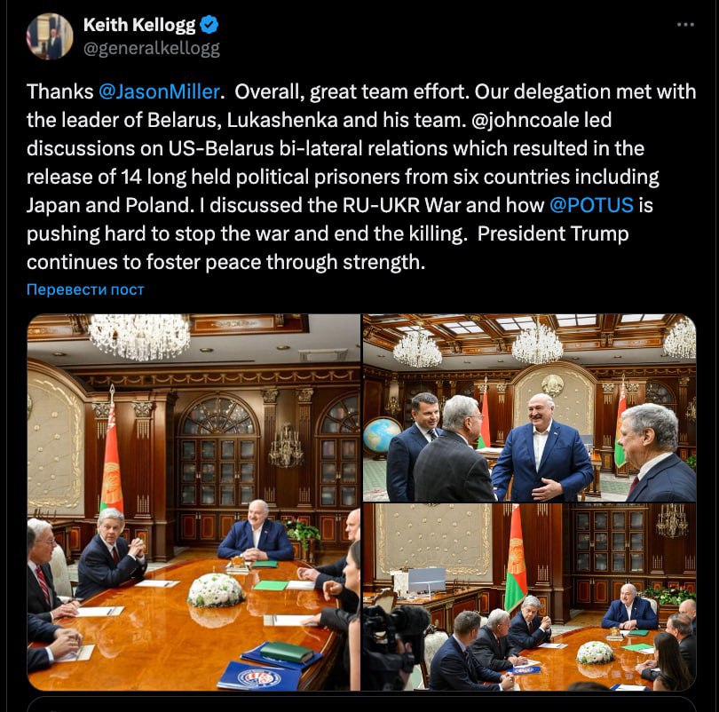 18.22 Келлог и Лукашенко обсуждали войну в Украине, сообщил спецпредставитель Трампа в Х.