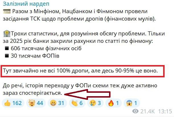 Еще один интересный момент в сообщении Ярослава Железняка - это его уточнение о том, что не все 100% лиц с принудительно закрытыми счетами являются дропами, а только 90-95% людей.
