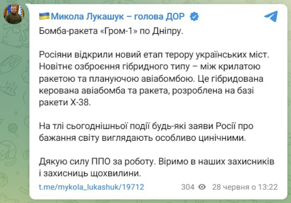 15:13 Новейшая бомба-ракета "Гром-1", которую сбили над Днепром, – это гибрид бомбы и ракеты, созданный на базе ракеты Х-38, сообщил глава Днепропетровского облсовета Лукашук в своем тг-канале.