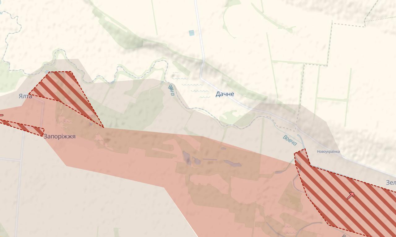 На карте указано, что армия РФ продвинулась сразу на шести участках на юге Донецкой области около границы с Днепропетровской - от Шевченко (о захвате которого еще несколько дней назад заявила РФ) до Ялты.