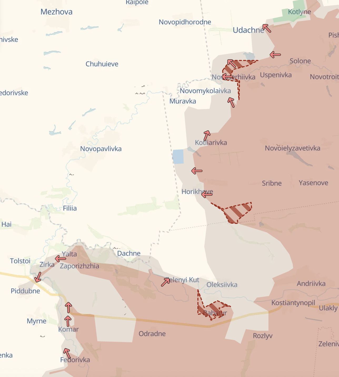 В то же время Deep State фиксирует ряд других продвижений у границ Днепропетровской области - в Новосергеевке и Богатыре (по данным "Мучного", оба села давно захвачены), а также в районе Орехового.