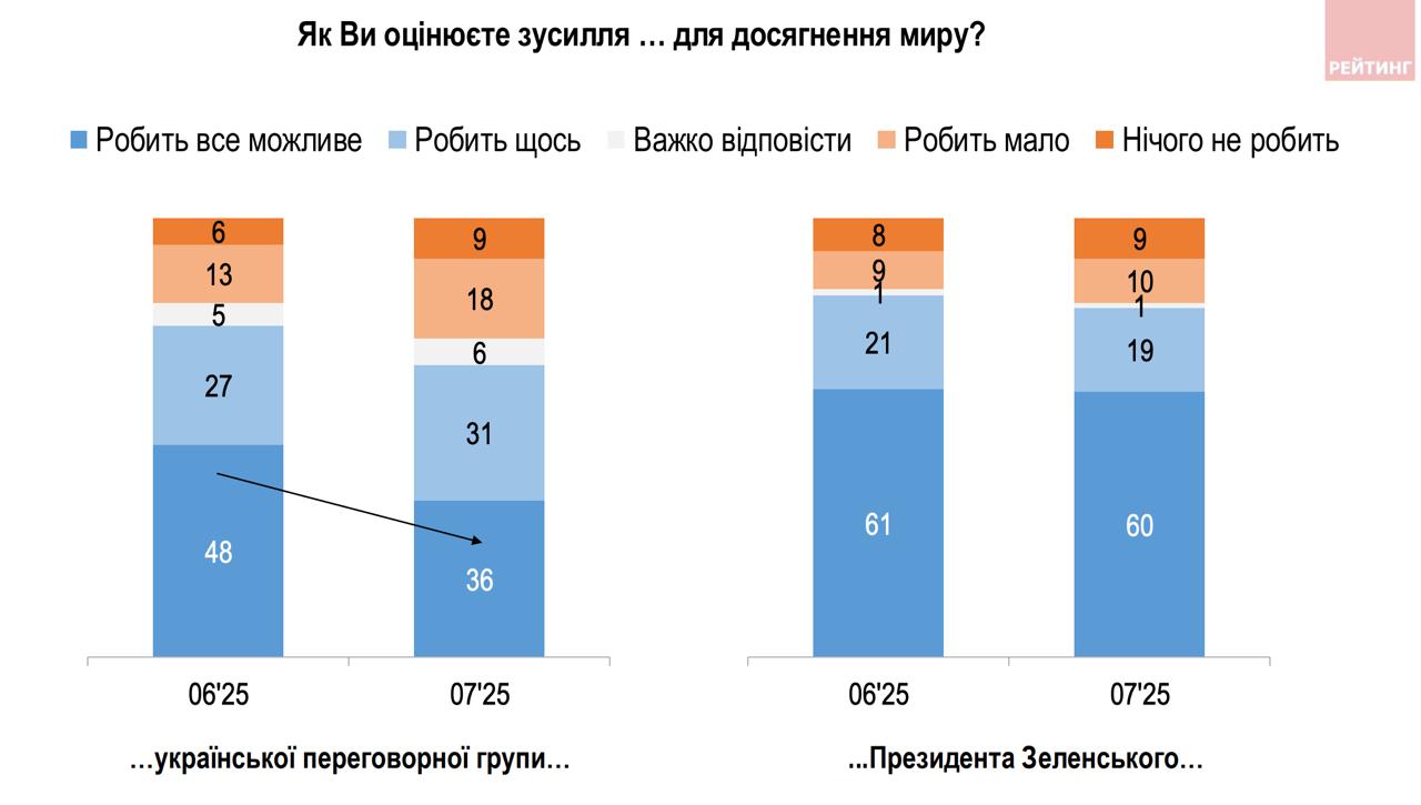 За минувший месяц стало на 12% меньше граждан, которые считают, что украинская переговорная группа делает все возможное для достижения мира.
