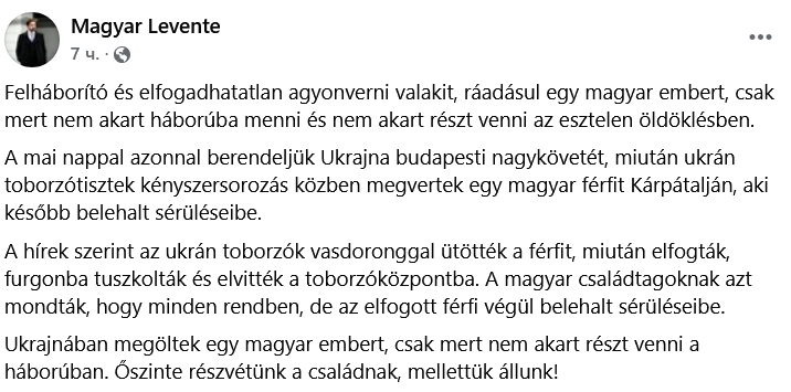 "Мы вызвали посла Украины в Будапеште после того, как украинские офицеры на призывном пункте на Закарпатье избили венгра во время принудительного призыва на военную службу. Позже он скончался от полученных травм. Как сообщается, украинские вербовщики избили мужчину железными прутьями после того, как схватили его, затолкали в фургон и доставили на призывной пункт. Членам его семьи говорили, что с ним все в порядке, но задержанный мужчина в конце концов скончался от полученных травм. Венгр был убит в Украине, потому что не хотел участвовать в войне", - заявил венгерский дипломат.