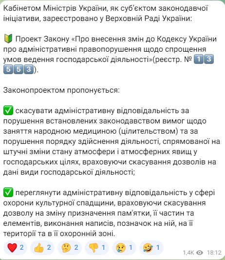 Законопроект в частности предлагает "отменить административную ответственность за нарушение установленных законодательством требований по занятию народной медициной (целительством) и за нарушение порядка осуществления деятельности, направленной на искусственные изменения состояния атмосферы и атмосферных явлений в хозяйственных целях, учитывая отмену разрешений на эти виды хозяйственной деятельности".