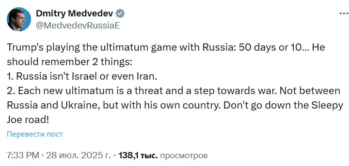 "Трамп играет в ультиматум с Россией: 50 дней или 10… Ему следует помнить две вещи: 1. Россия – это не Израиль и даже не Иран. 2. Каждый новый ультиматум – это угроза и шаг к войне. Не между Россией и Украиной, а с его собственной страной. Не идите по пути Сонного Джо", – написал Медведев.
