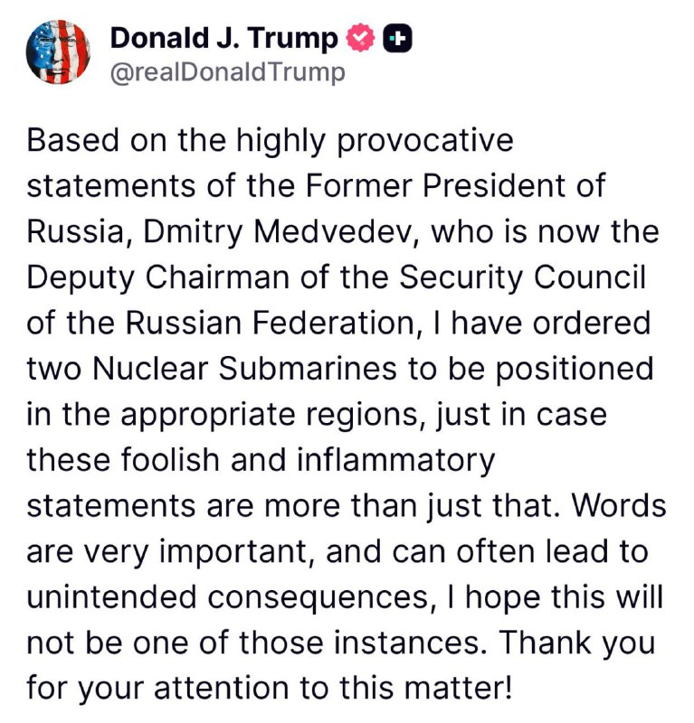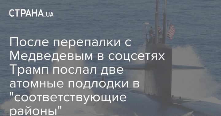 "В связи с провокационными заявлениями Медведева, который в настоящее время является заместителем председателя Совета безопасности РФ, я распорядился разместить две атомные подводные лодки в соответствующих районах на случай, если эти глупые и провокационные заявления окажутся чем-то большим", – написал президент США.