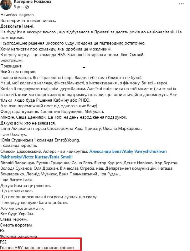 Источники "Страны" сообщают, что Пышного подтолкнул к этому пост Рожковой о выигрыше дела "Приватбанка", в котором она публично упрекнула действующего главу НБУ в том, что он не поздравил ее с этой победой.