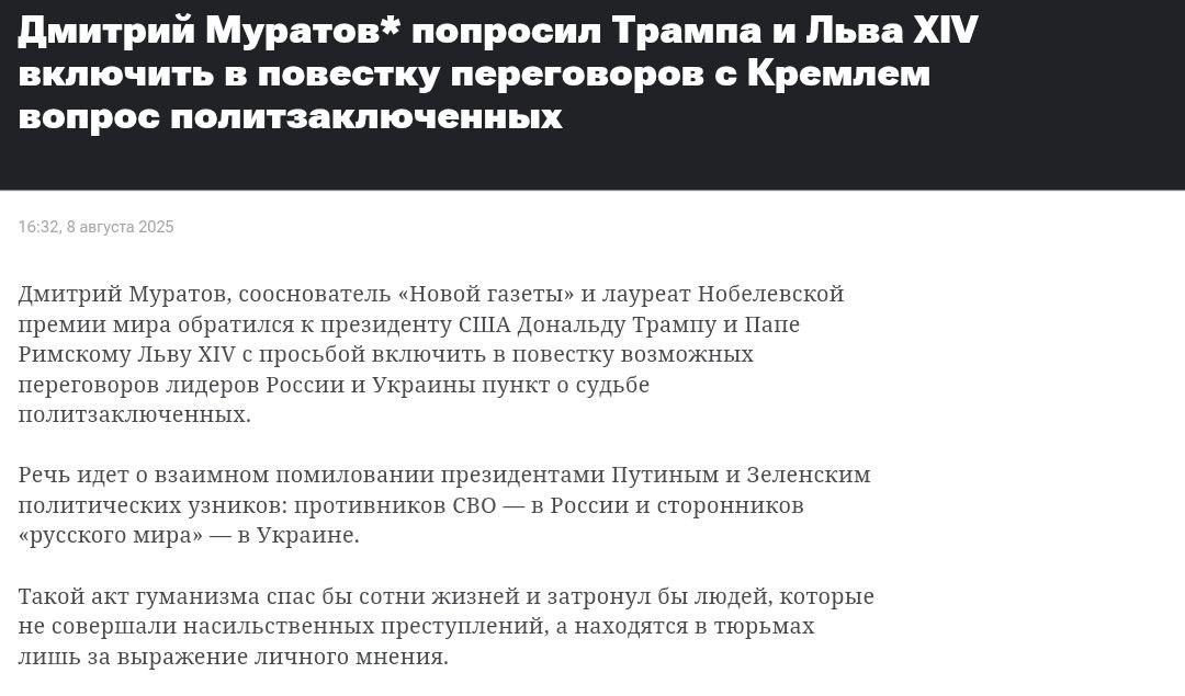 Главный редактор российской оппозиционной "Новой газеты", лауреат Нобелевской премии мира обратился к Трампу и папе римскому Льву XIV.