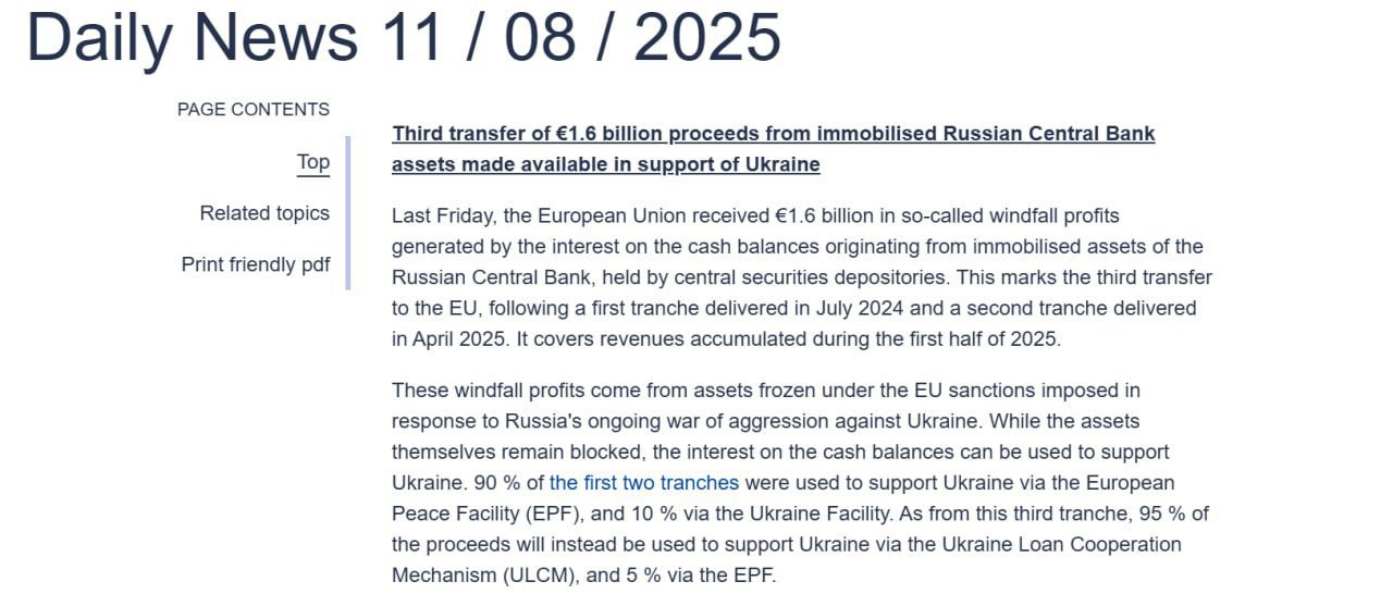 Там сказано, что Евросоюз получил избыточные доходы от замороженных активов Центрального банка России, которые станут третьим переводом от ЕС.