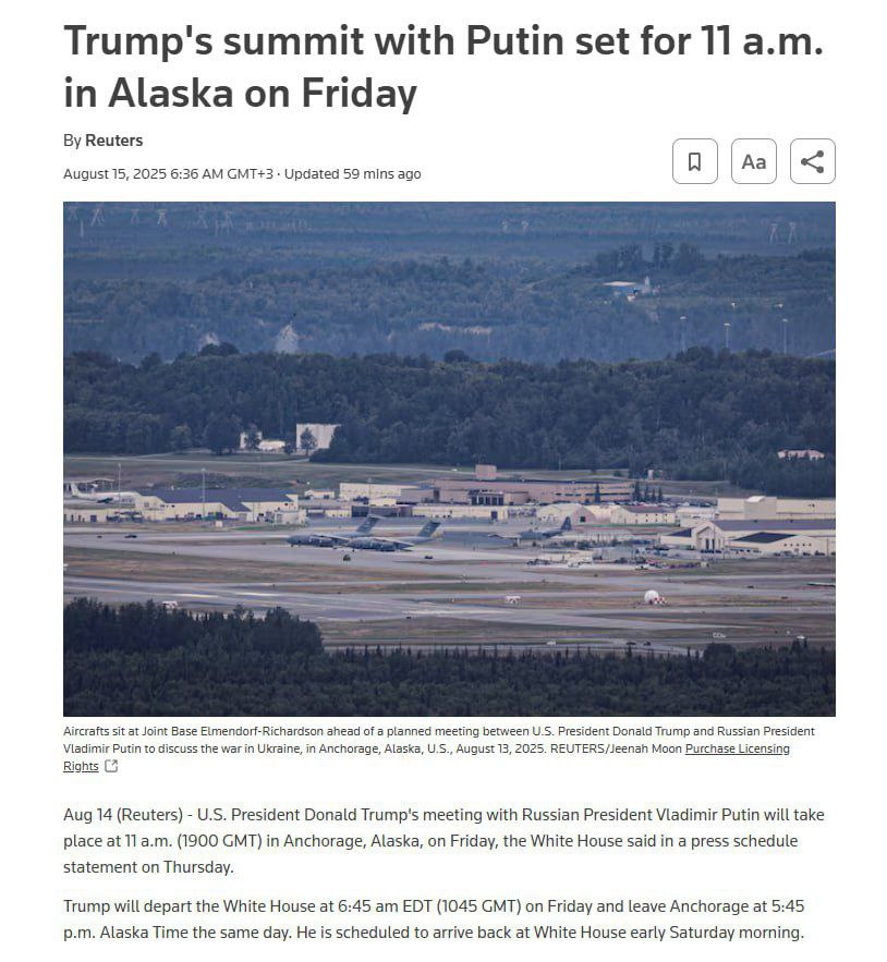 Встреча Трампа и Путина на Аляске начнётся сегодня, 15 августа, в 11:00 по местному времени, сообщает Белый дом, передает Reuters.