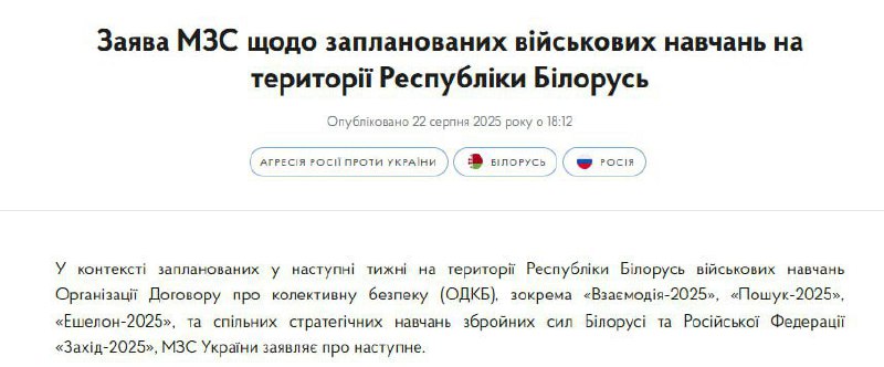 Украина предостерегла военных Беларуси от приближения к границам во время учений "Запад-2025" с Россией