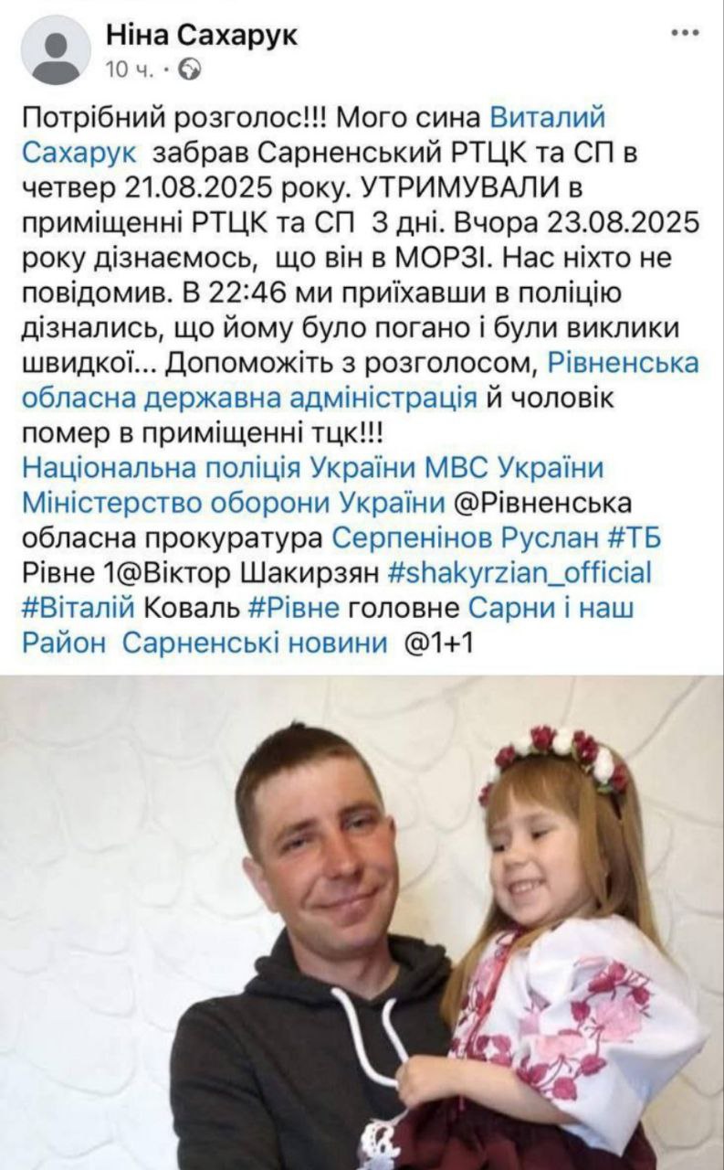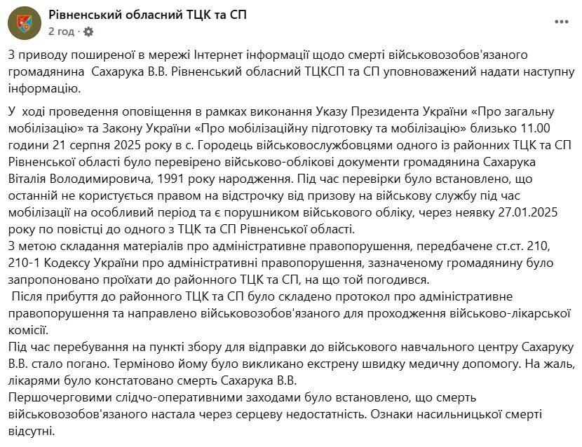 15:13 Ровенский ТЦК заявляет, что мобилизованный Виталий Сахарук погиб из-за сердечной недостаточности после успешно пройденной ВВК, и его не били.