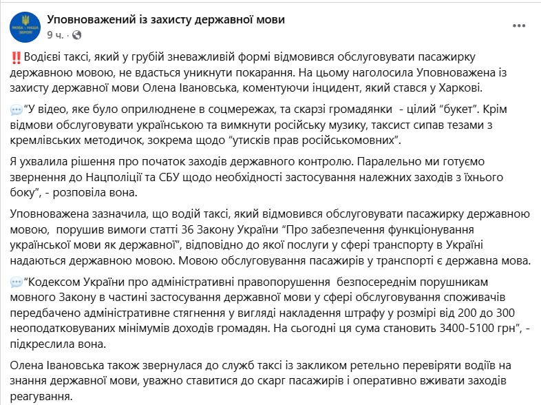 Она написала, что водитель, который откажется обслуживать клиента на украинском, будет оштрафован на 3400-5100 грн.