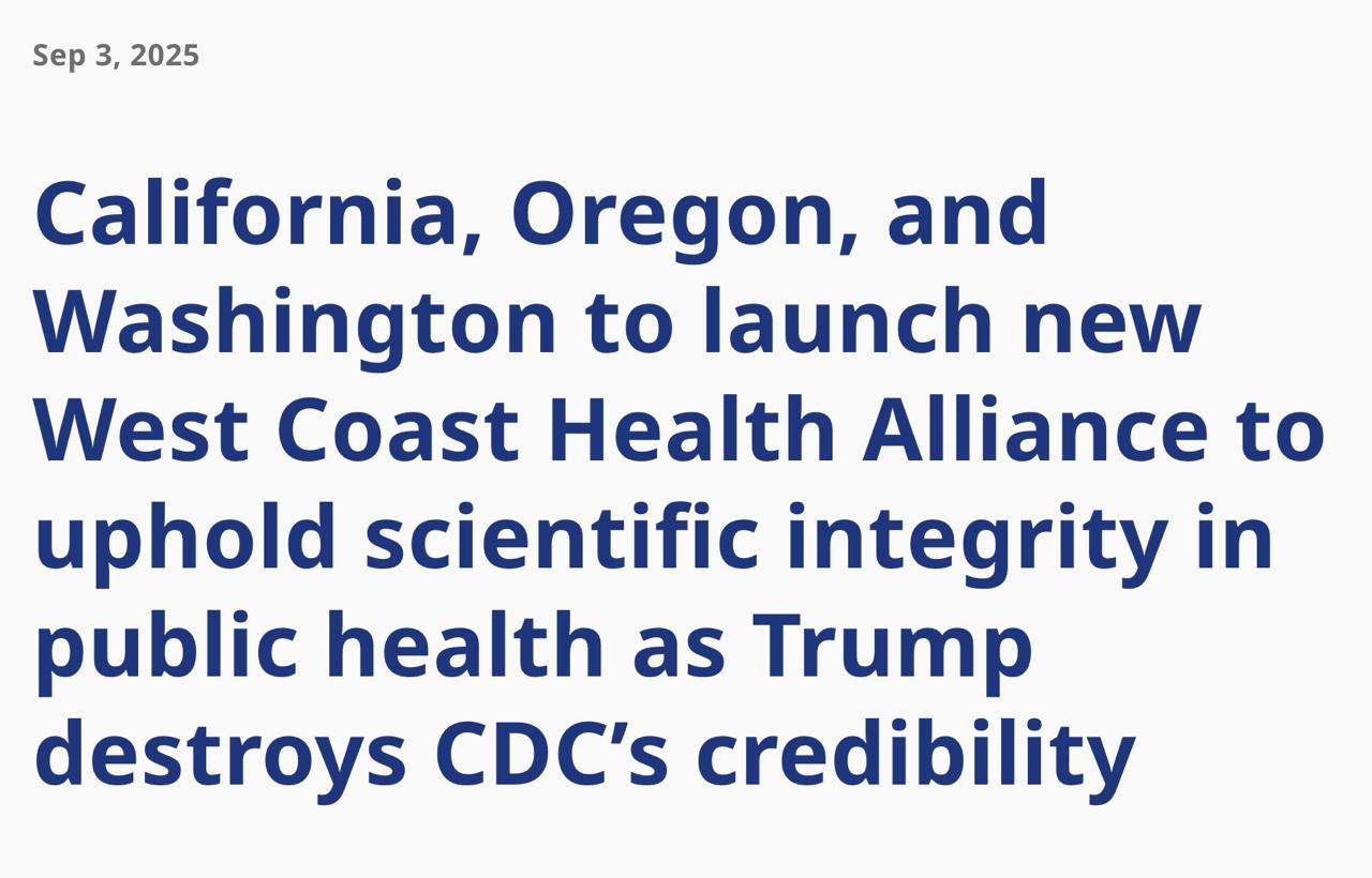 "В ответ на недавние действия федерального правительства, которые подорвали независимость CDC и вызвали обеспокоенность по поводу политизации науки, Калифорния, Орегон и Вашингтон начинают процесс предоставления своим жителям единых рекомендаций на основе фактических данных относительно того, кому следует делать прививки, а также для обеспечения доступа общественности к достоверной информации, которая позволит быть уверенным в безопасности и эффективности вакцин", - говорится в сообщении.