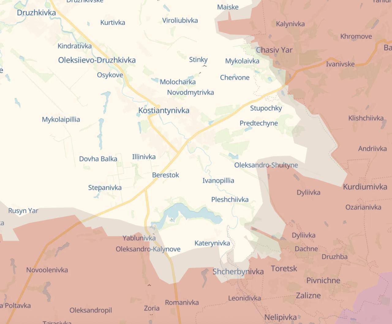 На данный момент в районе Константиновки вся она исчезла, перейдя преимущественно под контроль РФ или в серую зону. Из того, что смогли освободить ВСУ в ходе контрнаступления два года назад, "зеленым" остался лишь небольшой участок у Орехово-Васильевки (к северо-западу от Бахмута).