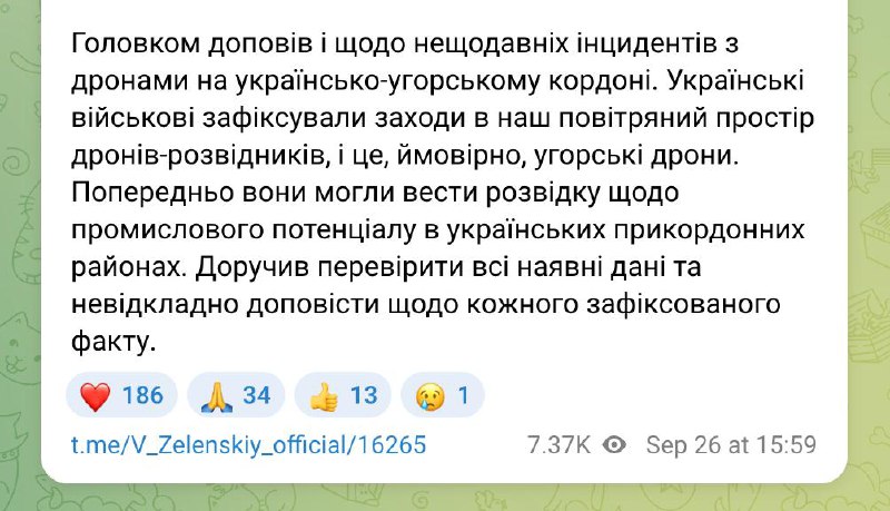 "Главком доложил о недавних инцидентах с дронами на украинско-венгерской границе. Украинские военные зафиксировали заходы в наше воздушное пространство дронов-разведчиков, и это, вероятно, венгерские дроны. Предварительно они могли вести разведку промышленного потенциала в украинских приграничных районах. Поручил проверить все имеющиеся данные и безотлагательно доложить о каждом зафиксированном факте", - пишет президент по итогам встречи с Сырским.