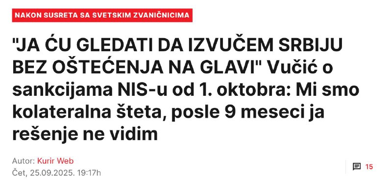 "Россияне являются мажоритарным партнёром в NIS, но высокую цену заплатим именно мы. Нас ждут тяжёлые времена и тяжёлая зима. Мы сделаем всё возможное, чтобы граждане имели тёплую зиму в своих домах, чтобы они не беспокоились о снабжении топливом. Теперь после этого у нас всё дополнительно осложняется и создаёт политические, экономические и всяческие другие проблемы. Мы будем бороться и искать выход из этой исключительно тяжёлой ситуации, вести переговоры. Уже 8–9 месяцев я этим занимаюсь круглосуточно, но ещё не нашёл решения", - признался Вучич.