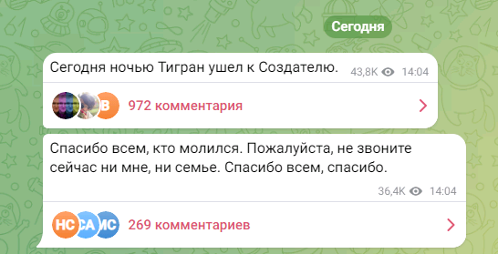 "Сегодня ночью Тигран ушел к Создателю. Спасибо всем, кто молился. Пожалуйста, не звоните сейчас ни мне, ни семье", - написала Симоньян.