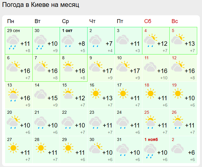 Согласно прогнозу погоды в Киеве, с 1 по 9 октября температура днем будет колебаться от +7 до +17, ночные температуры - от +3 до +9.