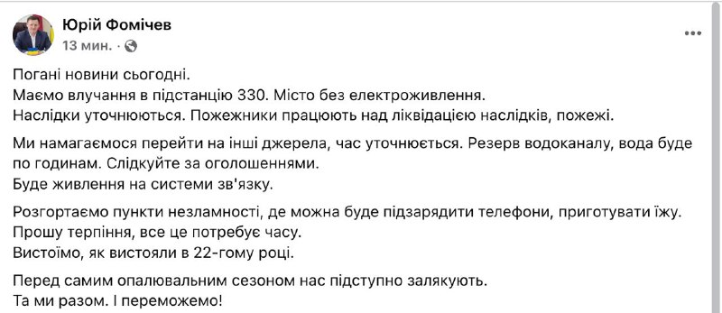 Напомним, ранее сегодня был удар по энергообъекту в Славутиче Киевской области, после чего отключение начались и в Черниговской области.