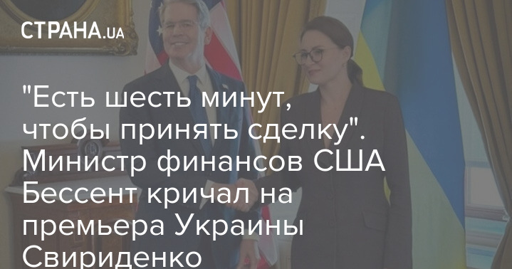"В конце февраля во время видеозвонка министр финансов Скотт Бессент крикнул г-же Свириденко, что у неё есть шесть минут, чтобы принять сделку, иначе переговоры будут закончены", – пишет газета.