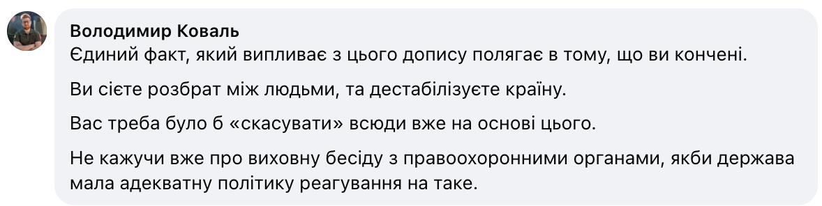 "Единственный факт, который вытекает из этого поста, заключается в том, что вы конченый. Вы сеете рознь между людьми и дестабилизируете страну. Вас следовало бы отменить повсюду уже на основании этого. Не говоря уже о воспитательной беседе с правоохранительными органами, если бы государство имело адекватную политику реагирования на подобное", - обратился к Капранову военнослужащий и блогер Владимир Коваль.