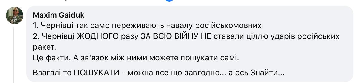 "Сумы стали целью ударов российских ракет. Чернигов стал целью ударов российских ракет. Кременчуг стал целью ударов российских ракет. Запорожье стало целью ударов российских ракет. Киев стал целью ударов российских ракет. Харьков стал целью ударов российских ракет. Капранов долбо@б. Это факты. А связи между ними можете поискать сами", - передразнил умозаключения писателя эксперт по ЖКХ и энергетике Олег Попенко.