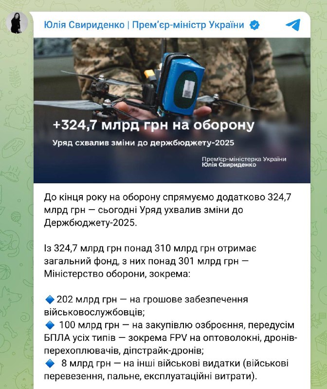 Еще 100 миллиардов гривен пойдут на закупку вооружений, прежде всего БпЛА. 4,3 миллиарда гривен на закупку дронов получит Государственная служба специальной связи и защиты информации.