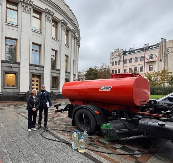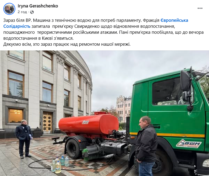 По её словам, в Верховную Раду была подана цистерна с технической вода для базовых нужд парламента. Из цистерны сотрудники Рады набирали воду в пятилитровые бутыли из-под питьевой воды. Кроме того, в правительственный квартал Киева, но уже к зданию Кабинета министров доставили биотуалеты.