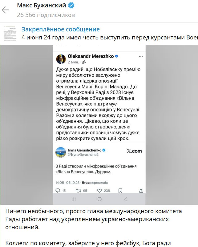На фоне возмущения Белого дома тем, что президент США Дональд Трамп не получил Нобелевскую премию мира, глава Комитета Верховной Рады по международным делам и народный депутат от "Слуги народа" Александр Мережко поделился своей радостью, что премию получила венесуэльская оппозиционерка Мария Корине Мачадо.