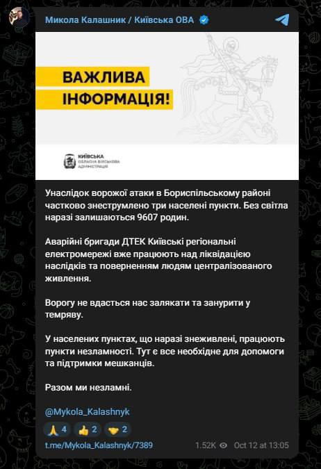 14:26 После ударов по Бориспольскому району частично обесточены три населенных пункта, сообщил глава Киевской ОВА Калашников.