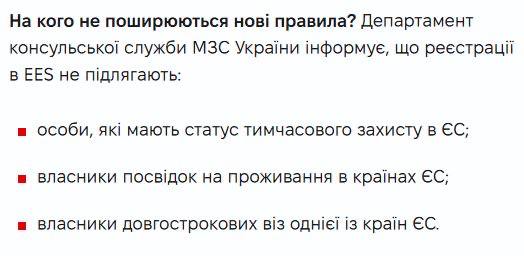 Не подлежат регистрации в EES украинцы, имеющие статус временной защиты в ЕС, владельцы вида на жительство и владельцы долгосрочных виз.