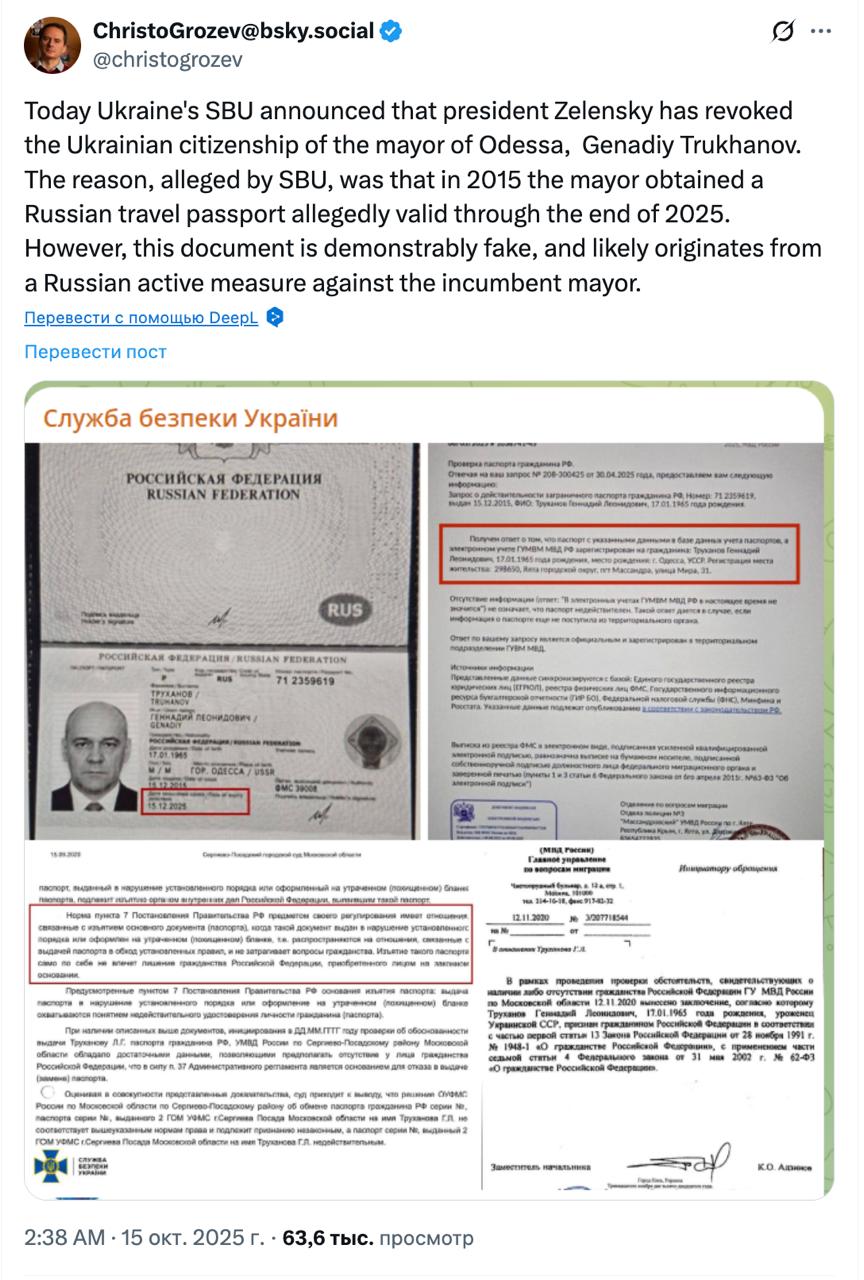 "Служба безопасности Украины сообщила, что президент Зеленский лишил украинского гражданства мэра Одессы Геннадия Труханова. Причиной, по словам СБУ, стало то, что в 2015 году мэр получил российский загранпаспорт, якобы действительный до конца 2025 года. Однако этот документ является явно поддельным и, вероятно, является результатом активных действий России против действующего мэра", - сказано в публикации журналиста.